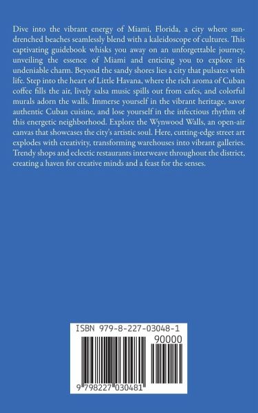 Dive into the vibrant energy of Miami, Florida, a city where sun-drenched beaches seamlessly blend with a kaleidoscope of cultures. This captivating guidebook whisks you away on an unforgettable journey, unveiling the essence of Miami and enticing you to explore its undeniable charm. Beyond the sandy shores lies a city that pulsates with life. Step into the heart of Little Havana, where the rich aroma of Cuban coffee fills the air, lively salsa music spills out from cafes, and colorful murals adorn the walls. Immerse yourself in the vibrant heritage, savor authentic Cuban cuisine, and lose yourself in the infectious rhythm of this energetic neighborhood. Explore the Wynwood Walls, an open-air canvas that showcases the city's artistic soul. Here, cutting-edge street art explodes with creativity, transforming warehouses into vibrant galleries. Trendy shops and eclectic restaurants interweave throughout the district, creating a haven for creative minds and a feast for the senses. This book was created with a combination of human editorial oversight and AI-assisted writing tools.