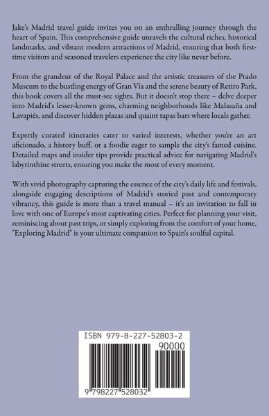 Jake's Madrid travel guide invites you on an enthralling journey through the heart of Spain. This comprehensive guide unravels the cultural riches, historical landmarks, and vibrant modern attractions of Madrid, ensuring that both first-time visitors and seasoned travelers experience the city like never before. From the grandeur of the Royal Palace and the artistic treasures of the Prado Museum to the bustling energy of Gran Vía and the serene beauty of Retiro Park, this book covers all the must-see sights. But it doesn't stop there - delve deeper into Madrid's lesser-known gems, charming neighborhoods like Malasaña and Lavapiés, and discover hidden plazas and quaint tapas bars where locals gather. Expertly curated itineraries cater to varied interests, whether you're an art aficionado, a history buff, or a foodie eager to sample the city's famed cuisine. Detailed maps and insider tips provide practical advice for navigating Madrid's labyrinthine streets, ensuring you make the most of every moment. With vivid photography capturing the essence of the city's daily life and festivals, alongside engaging descriptions of Madrid's storied past and contemporary vibrancy, this guide is more than a travel manual - it's an invitation to fall in love with one of Europe's most captivating cities. Perfect for planning your visit, reminiscing about past trips, or simply exploring from the comfort of your home, "Exploring Madrid" is your ultimate companion to Spain's soulful capital. This book was created with a combination of human editorial oversight and AI-assisted writing tools.