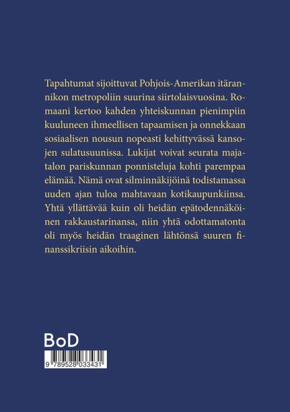 Tämä romaani on kertomus Jakon ja Jennyn yllättävästä kohtaamisesta 1800-luvun viimeisillä vuosikymmenillä Pohjois-Amerikan itärannikon suurkaupungissa. Lukijat voivat seurata kahden yhteiskunnan pienimpiin kuuluneen henkilön ihmeellisen rakkaustarinan ja heidän epätodennäköisen sosiaalisen nousunsa nopeasti kehittyvässä kansojen sulatusuunissa. Jenny on irlantilaistaustainen toisen polven siirtolainen. Entisellä merimiehellä Jakolla taas on pohjoisnorjalainen tausta ja hän on vahingossa ajautunut Amerikkaan ja tällöin törmännyt majatalon palvelijattareen, tulevaan vaimoonsa. Tässä kirjassa kuvaillaan majatalon maanläheisen pariskunnan ponnisteluja tulevaisuutensa turvaamiseksi. He saavat läheltä seurata uuden ajan tuloa mahtavaan kotikaupunkiinsa. Rakastavaiset lähtevät traagisesti suuren finanssikriisin aikoihin.
