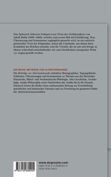 Jakob Balde (1604-1664) ist einer der bedeutendsten neulateinischen Dichter. Während sein lyrisches Werk der früheren und mittleren Periode gut erforscht wurde, ist sein satirisches Werk der späten Periode nahezu vollständig vernachlässigt worden. Die Schrift Solatium Podagricorum (Trost der Gichtkranken) wird hier zum ersten Mal in deutscher Übersetzung und mit einem ausführlichen Kommentar sowie einer Einführung zugänglich gemacht. Das reichausgeprägte Genus der Paradoxenkomien der neulateinischen Dichter geht auf das Lob der Torheit zurück, das Erasmus von Rotterdam 1509 gedichtet hat. Während Willibald Pirckheimer 1525 als erster ein Lob des Podagra schuf, bedeutet Baldes Solatium zugleich den Höhepunkt und das Ende der literarischen Podagra-Elogien. Balde führt den an dieser Krankheit der Reichen Leidenden die glücklichen Umstände, aus denen sie entsteht, und die Vorteile, die sie mit sich bringt, in ebenso scherzhaft-unterhaltender wie zum Nachdenken anregender Weise vor Augen. Die 43 in Prosa verfassten Kapitel des ersten und die 89 Gedichte des zweiten Buches geben einen reichen Einblick in die Kultur und Bildung der gehobenen Schicht des 17. Jahrhunderts. Die Schrift ist für Literaturwissenschaftler, Historiker und Medizinhistoriker von Interesse.