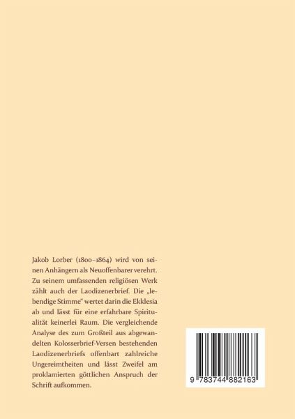 Jakob Lorber (1800-1864) wird von seinen Anhängern als Neuoffenbarer verehrt. Zu seinem umfassenden religiösen Werk zählt auch der Laodizenerbrief. Die "lebendige Stimme" wertet darin die Ekklesia ab und lässt für eine erfahrbare Spiritualität keinerlei Raum. Die vergleichende Analyse des zum Großteil aus abgewandelten Kolosserbrief-Versen bestehenden Laodizenerbriefs offenbart zahlreiche Ungereimtheiten und lässt Zweifel am proklamierten göttlichen Anspruch der Schrift aufkommen.