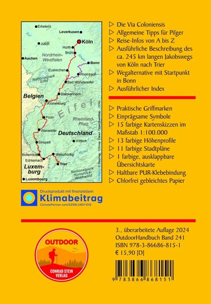 Wer im Norden oder Westen Deutschlands lebt und seinen persönlichen Jakobsweg zuhause beginnt, wird Köln als ein markantes Zwischenziel ansteuern. Nach einem Besuch im Kölner Dom mit seinem weltberühmten Dreikönigsschrein stellt sich der Pilger die Frage, wie er seinen Jakobsweg fortsetzt. Die beste Wahl ist es, durch die Eifel nach Trier zu laufen. Der Weg ist auf dieser Strecke perfekt markiert, die Landschaft ist abwechslungsreich und die Menschen sympathisch.Der Pilgerführer beschreibt den knapp 245 km langen Weg für Fuß- und Radpilger. Er gibt Hinweise zu Unterkünften, Einkaufsmöglichkeiten und Sehenswürdigkeiten am Wegesrand.Aus der Kölner Bucht führt der Weg zunächst über den Villerücken in die Zülpicher Börde. Bei Euskirchen erreicht er die Voreifel. Hier geht es hinauf in die Kalkeifel und durch die westliche Hocheifel zu den beiden Abkühlung versprechenden Eifelregionen Schneifel und Islek (= Eisland). Am Rand des Ferschweiler Plateaus folgt ein Grenzübertritt ins luxemburgische Echternach, bevor der Pilger im Moseltal das Grab des Apostels Matthias in Trier und damit das Ziel dieses Pilgerführers erreicht.