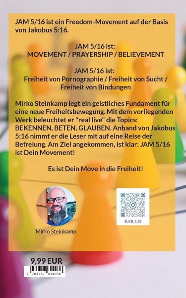 JAM 5/16 ist ein Freedom-Movement auf der Basis von Jakobus 5:16 JAM 5/16 ist: Movement / Prayership / BelievementJAM 5/16 ist: Freiheit von Pornographie / Freiheit von Sucht / Freiheit von BindungenMirko Steinkamp legt ein geistliches Fundament für eine neue Freiheitsbewegung. Mit dem vorliegenden Werk beleuchtet er "real live" die Topics Bekennen, Beten, Glauben. Anhand von Jakobus 5:16 nimmt er die Leser mit auf eine Reise der Befreiung. Am Ziel angekommen, ist klar: JAM 5/16 ist Dein Movement! Es ist Dein Move in die Freiheit!