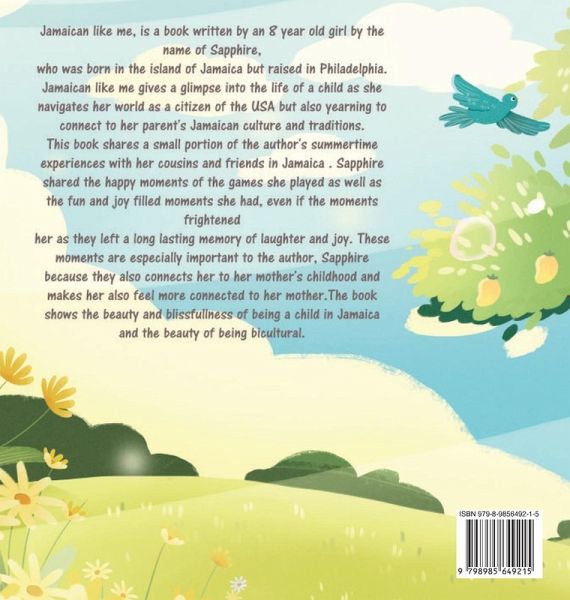 Jamaican like me, is a beautiful children's book written by an 8year old girl by the name of Sapphire, who was born in the island of Jamaica but raised in Philadelphia. Jamaican like me gives a glimpse into the life of a child as she navigates her world as a citizen of the USA but also yearning to connect to her parent's Jamaican culture and traditions. This book shares a small portion of the author's summertime experiences with her cousins and friends in Jamaica . Sapphire shared the happy moments of the games she played as well as the fun and joy filled moments she had, even if the moments frightened her as they left a long lasting memory of laughter and joy. These moments are especially important to the author, Sapphire because they also connects her to her mother's childhood and makes her also feel more connected to her mother. The book shows the beauty and blissfulness of being a child in Jamaica and the beauty of being bicultural.