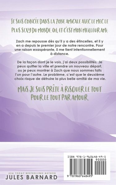 Je suis coincée dans la zone amicale avec le mec le plus sexy du monde. Oh, et c'est mon meilleur ami. Zach me repousse dès qu'il y a des étincelles, et il y en a depuis le premier jour de notre rencontre. Pour une raison exaspérante, il me tient intentionnellement à distance. De la façon dont je le vois, j'ai deux possibilités. Je peux quitter la ville et prendre un nouveau départ, ou je peux montrer à Zach que nous sommes faits l'un pour l'autre. Le problème, c'est que le deuxième choix risque de détruire la plus belle amitié de ma vie. Mais je suis prête à risquer le tout pour le tout par amour. Une histoire d'amour entre amis nominée au RITA Awards.