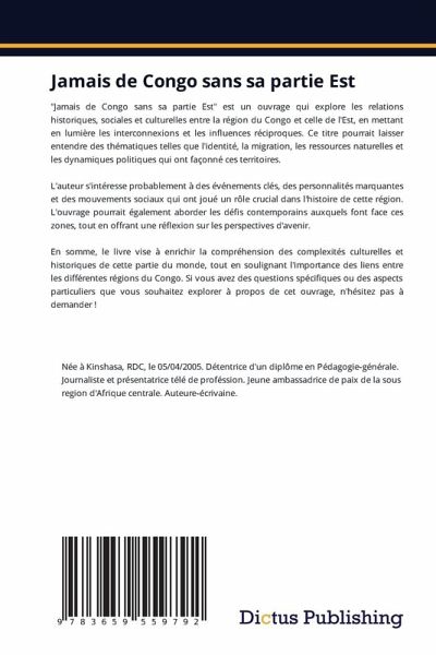 "Jamais de Congo sans sa partie Est" est un ouvrage qui explore les relations historiques, sociales et culturelles entre la région du Congo et celle de l'Est, en mettant en lumière les interconnexions et les influences réciproques. Ce titre pourrait laisser entendre des thématiques telles que l'identité, la migration, les ressources naturelles et les dynamiques politiques qui ont façonné ces territoires.L'auteur s'intéresse probablement à des événements clés, des personnalités marquantes et des mouvements sociaux qui ont joué un rôle crucial dans l'histoire de cette région. L'ouvrage pourrait également aborder les défis contemporains auxquels font face ces zones, tout en offrant une réflexion sur les perspectives d'avenir.En somme, le livre vise à enrichir la compréhension des complexités culturelles et historiques de cette partie du monde, tout en soulignant l'importance des liens entre les différentes régions du Congo. Si vous avez des questions spécifiques ou des aspects particuliers que vous souhaitez explorer à propos de cet ouvrage, n'hésitez pas à demander !