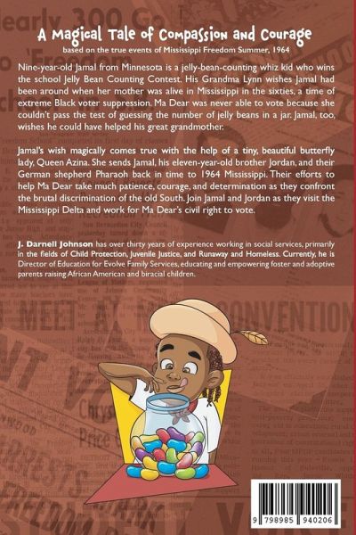 A magical tale of passion and courage based on the true events of Mississippi Freedom Summer 1964. Nine-year-old Jamal from Minneapolis is a jellybean counting whiz kid and wins the school jellybean counting contest. His Grandma Lynn wished that Jamal would have been around when her mother was in Mississippi and was never able to vote because she couldn't guess the number of jellybeans in a jar. Jamal wished he could have lived during that time too to help his great grandmother, Ma' dear. Well, his dream comes true with the help of a tiny and beautiful butterfly lady, Queen Azina. Azina magically sends Jamal, his eleven-year-old brother Jordan, and their German Shepherd dog Pharaoh back in time to 1964 Mississippi. They meet civil rights activist leader Fannie Lou Hamer and others with the mission to find Ma' dear and count the number of jellybeans in the jar so she can register her to vote. It will take much patience, courage and determination with some of the toughest forms of voter suppression in history to make that happen. Join Jamal and Jordan as they visit the Mississippi Delta as Freedom fighters.