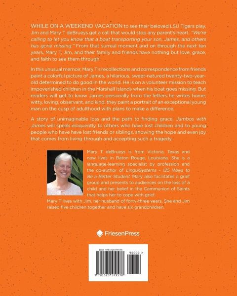 While on a weekend vacation to see their beloved LSU Tigers play, Jim and Mary T deBrueys get a call that would stop any parent's heart. "We're calling to let you know that a boat transporting your son, James, and others has gone missing." From that surreal moment and on through the next ten years, Mary T, Jim, and their family and friends have nothing but love, grace, family, and faith to see them through. In this unusual memoir, Mary T's recollections and correspondence from friends paint a colorful picture of James, a hilarious, sweet-natured twenty-two-year-old determined to do good in the world. He is on a volunteer mission to teach impoverished children in the Marshall Islands when his boat goes missing. But readers will get to know James personally from the letters he writes home; witty, loving, observant, and kind, they paint a portrait of an exceptional young man on the cusp of adulthood, with plans to make a difference. A story of unimaginable loss and the path to finding grace, Jambos with James will speak eloquently to others who have lost children and to young people who have lost friends and/or siblings, showing the hope and even joy that comes from living through and accepting such a tragedy.