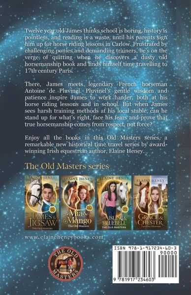 Twelve year old James thinks school is boring, history is pointless, and reading is a waste, until his parents sign him up for horse riding lessons in Carlow. Frustrated by challenging ponies and demanding trainers, he's on the verge of quitting when he discovers a dusty old horsemanship book and finds himself time travelling to 17th century Paris. There, James meets legendary French horseman Antoine de Pluvinel. Pluvinel's gentle wisdom and patience inspire James to work harder, both at his horse riding lessons and in school. But when James sees harsh training methods at his local stable, can he stand up for what's right, face his fears and prove that true horsemanship comes from respect, not force? Brimming with horse riding tips, fascinating equestrian history, and a touch of time travel magic, this exciting pony adventure is perfect for horse lovers aged 8 to 14 and is an ideal gift for birthdays and Christmas! The Old Masters Series This book is part of the Old Masters series. The Old Masters series is a remarkable historical time travel series, celebrating the famous historical figures including Antonie de Pluvinel, William Cavendish, the first Duke of Newcastle, and François Robichon de La Guérinière. This captivating pony adventure series is written by award-winning Irish equestrian author, Elaine Heney.