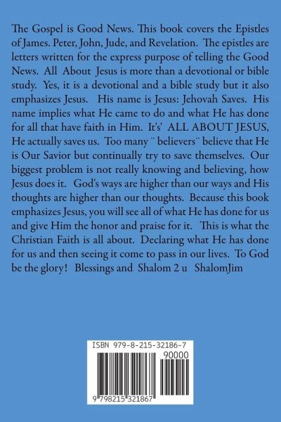 The Gospel is Good News. This book covers the Epistles of James. Peter, John, Jude, and Revelation. The epistles are letters written for the express purpose of telling the Good News. All About Jesus is more than a devotional or bible study. Yes, it is a devotional and a bible study but it also emphasizes Jesus. His name is Jesus: Jehovah Saves. His name implies what He came to do and what He has done for all that have faith in Him. It's' ALL ABOUT JESUS, He actually saves us. Too many ¨ believers¨ believe that He is Our Savior but continually try to save themselves. Our biggest problem is not really knowing and believing, how Jesus does it. God's ways are higher than our ways and His thoughts are higher than our thoughts. Because this book emphasizes Jesus, you will see all of what He has done for us and give Him the honor and praise for it. This is what the Christian Faith is all about. Declaring what He has done for us and then seeing it come to pass in our lives. To God be the glory! Blessings and Shalom 2 u ShalomJim