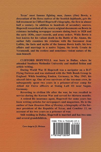 Texas' most famous fighting man, James (Jim) Bowie, a descendant of the fierce natives of the Scottish Highlands, gets the full treatment in Clifford Hopewell's biography, the first in almost half a century. In addition to hundreds of secondary sources, Hopewell researched all the scarce original documents on Bowie in existence including newspaper accounts dating back to 1928 and the early 1830s, court records, and army orders. While Bowie is best known for his valiant death in the Battle of the Alamo, the author fully examines his relations with the buccaneer Jean Lafitte, the facts and myths of the famous Bowie knife, his love affairs and marriage to a native Tejana, the lovely Ursala de Veramendi, and the restless and sometimes violent nature of the man himself.