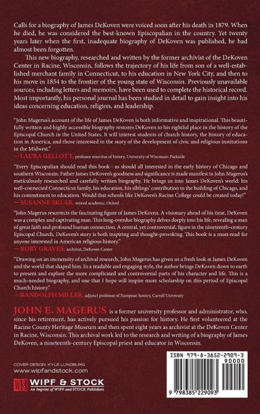 Calls for a biography of James DeKoven were voiced soon after his death in 1879. When he died, he was considered the best-known Episcopalian in the country. Yet twenty years later when the first, inadequate biography of DeKoven was published, he had almost been forgotten. This new biography, researched and written by the former archivist of the DeKoven Center in Racine, Wisconsin, follows the trajectory of his life from son of a well-established merchant family in Connecticut, to his education in New York City, and then to his move in 1854 to the frontier of the young state of Wisconsin. Previously unavailable sources, including letters and memoirs, have been used to complete the historical record. Most importantly, his personal journal has been studied in detail to gain insight into his ideas concerning education, religion, and leadership.