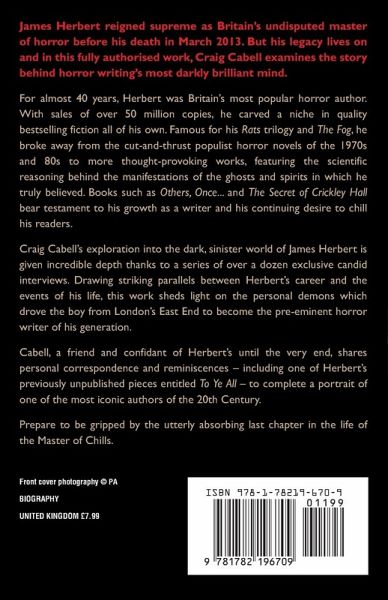 For almost 40 years, Herbert was Britain's most popular horror author. With sales f over 50 million copies, he carved a niche in quality bestselling fiction all of his own. Famous for his Rats trilogy and The Fog, he broke away from the cut-and-thrust populist horror novels of the 1970s and 80s to more thought-provoking works, featuring the scientific reasoning behind the manifestations of the ghosts and spirits in which he truly believed. Books such as Others, Once..and The Secret of Crickley Hall bear testament to his growth as a writer and his continuing desire to chill his readers. Craig Cabell's exploration into the dark, sinister world of James Herbert is given incredible depth thanks to a series of over a dozen exclusive candid interviews. Drawing striking parallels between Herbert's career and the events of his life, this work sheds light on the personal demons which drove the boy from London's East End to become the per-eminent horror writer of his generation. Cabell, a friend and confident of Herbert's until the very end, shares personal correspondence and reminiscences - including one of Herbert's previously unpublished pieces entitled To Ye All - to complete a portrait of one of the most iconic authors of the 20th Century. Prepare to be gripped by the utterly adsorbing last chapter in the life of the Master of Chills.