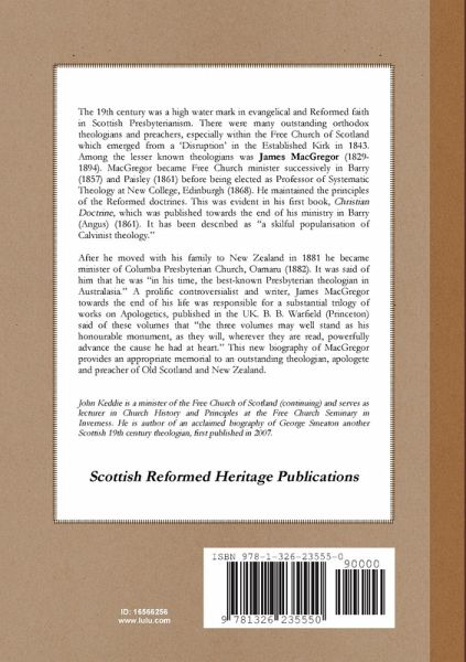 This is the first biography of a 19th century Presbyterian minister and theological Professor, James MacGregor (1829-1894). MacGregor was a minister in the Free Church of Scotland before being elected Professor of Systematic Theology at New College, Edinburgh. He served in that capacity from 1868 to 1881 before immigrating to New Zealand where he took a charge at Oamaru in the South Island (1882-1894). He was a staunch defender of orthodox evangelical views and in his later years wrote three great tomes in defence of Christian faith. He produced two of the best Christian books of their genre to come from the 19th century church: Christian Doctrine (1861) and The Sabbath Question (1866). This is the first biography of the subject and it contains a complete listing of all his writings.