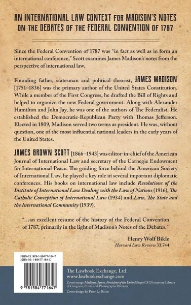 An international law context for Madison’s notes on the debates of the Federal Convention of 1787. Since the Federal Convention of 1787 was "in fact as well as in form an international conference," Scott examines James Madison’s notes from the perspective of international law. Founding father, statesman and political theorist, James Madison [1751–1836] was the primary author of the United States Constitution. While a member of the First Congress, he drafted the Bill of Rights and helped to organize the new Federal government. Along with Alexander Hamilton and John Jay, he was one of the authors of The Federalist. He established the Democratic-Republican Party with Thomas Jefferson. Elected in 1809, Madison served two terms as president. He was, without question, one of the most influential national leaders in the early years of the United States. xviii, 149pp.