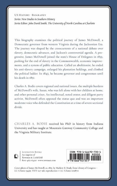 This biography examines the political journey of James McDowell, a Democratic governor from western Virginia during the Jacksonian Era. The journey was shaped by the crosscurrents of a national debate over slavery, democratic advances, and the Jackson's controversial agenda. A progressive, he joined the state's House of Delegates in 1833, pushing for the end of slavery in the Commonwealth, economic improvements, and a system of public education. Called an abolitionist, he ended his anti-slavery campaign, enlarged his plantation holdings, and climbed the political ladder. In 1843, he became governor and congressman until his death in 1851. The author covers regional and national issues, the multiple burdens of his wife, Susan, who was left alone with her children at home, and other personal crises. An intellectual, noted orator, and diligent party activist, McDowell often opposed the status quo and was an important moderate voice who defended the Constitution at a time of severe sectional divide.