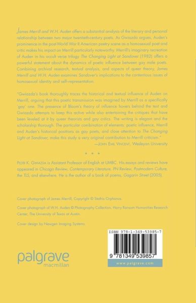 "Gwiazda s book thoroughly traces the historical and textual influence of Auden on Merrill, arguing that this poetic transmission was imagined by Merrill as a specifically gay one. The presence of Bloom s theory of influence hovers behind the text and Gwiazda attempts to keep this active while also entertaining the critiques that have been leveled at it by queer theorists and gay critics. The writing is elegant and the scholarship thorough. The particular combination of elements: poetic influence, Merrill and Auden s historical positions as gay poets, and close attention to The Changing Light at Sandover, make this study a very original contribution to Merrill criticism." - John Emil Vincent, Wesleyan University