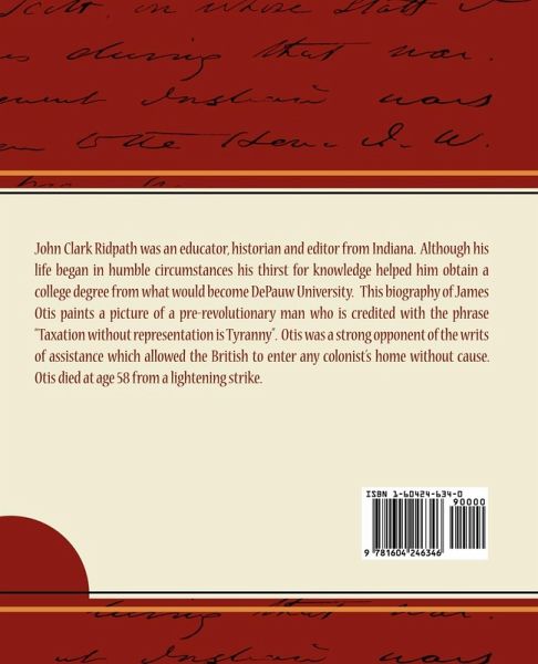 John Clark Ridpath was an educator, historian and editor from Indiana. Although his life began in humble circumstances his thirst for knowledge helped him obtain a college degree from what would become DePauw University. This biography of James Otis paints a picture of a pre-revolutionary man who is credited with the phrase "Taxation without representation is Tyranny". Otis was a strong opponent of the writs of assistance which allowed the British to enter any colonist's home without cause. Otis died at age 58 from a lightening strike.