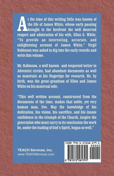 At the time of this writing little was known of the life of James White, whose early passing brought to the forefront the well deserved respect and admiration of his wife, Ellen G. White. "To provide an interesting, accurate, and enlightening account of James White," Virgil Robinson was asked to dig into the early records and write this volume. "This well written account, constructed from the documents of the time, makes that noble, yet very human man, live. May the knowledge of his dedication, his vision, his sacrifice, and his innate confidence in the triumph of the Church, inspire the generation who must carry to its conclusion the work he, under the leading of God's Spirit, began so well." -Arthur L. White