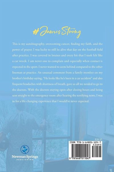 This is my autobiography, overcoming cancer, finding my faith, and the power of prayer. I was lucky to still be alive that day on the football field after practice. I was covered in bruises and every hit that I took felt like a car wreck. I am never one to complain and especially when contact is expected in the sport. I never wanted to seem behind compared to the other lineman at practice. An unusual comment from a family member on my brother's birthday saying, "He looks like he's been in a car accident" and also frequent headaches with shortness of breath, gave us all we needed to go to the…mehr