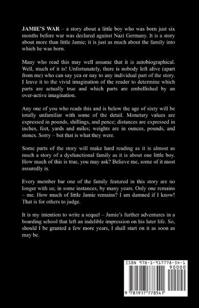 JAMIE'S WAR - a story about a little boy who was born just six months before war was declared against Nazi Germany. It is a story about more than little Jamie; it is just as much about the family into which he was born.Many who read this may well assume that it is autobiographical. Well, much of it is! Unfortunately, there is nobody left alive (apart from me) who can say yea or nay to any individual part of the story. I leave it to the vivid imagination of the reader to determine which parts are actually true and which parts are embellished by an over-active imagination.Any one of you who reads this and is below the age of sixty will be totally unfamiliar with some of the detail. Monetary values are expressed in pounds, shillings, and pence; distances are expressed in inches, feet, yards and miles; weights are in ounces, pounds, and stones. Sorry - but that is what they were.Some parts of the story will make hard reading as it is almost as much a story of a dysfunctional family as it is about one little boy. How much of this is true, you may ask? Believe me, some of it most assuredly is. Every member bar one of the family featured in this story are no longer with us; in some instances, by many years. Only one remains - me. How much of little Jamie remains? I am damned if I know! That is for others to judge.It is my intention to write a sequel - Jamie's further adventures in a boarding school that left an indelible impression on his later life. So, should I be granted a few more years, I shall start on it as soon as may be.