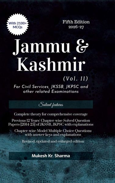 The new updated and enlarged Fifth Edition (2026-27)of 'Jammu & Kashmir Vol. II' now covers Union Territory of Jammu and Kashmir in an even more comprehensive manner. The book caters to the needs of not only JKPSC Civil Services aspirants, but JKSSB aspirants and undergraduate students also. Solved Question Papers of the JKSSB/JKPSC exams of the last 12 years (2014-25), both OMR based and CBT, including of latest exams conducted by JKSSB/JKPSC in 2025. SIX Jammu & Kashmir: Polity Manking of Constitution and Party System J&K Reorganisation Act, 2019 J&K Administrative System J&K Delimitation Commission SEVEN Jammu & Kashmir: Economy Jammu and Kashmir: Economic Profile Jammu and Kashmir: Energy Resources Jammu and Kashmir: Industries Jammu and Kashmir: Transport & Communication. Indus Water Treaty (1960) EIGHT Jammu & Kashmir: Tourism Jammu and Kashmir Tourism Policy Jammu & Kashmir: Ecotourism Tourist Places Jammu Region Tourist Places Kashmir Region Jammu and Kashmir: Pilgrimage Tourism Religious Places in Jammu Region Religious Places in Kashmir Region Buddhist Monuments in J&K and Ladakh NINE Jammu & Kashmir: Districts Jammu and Kashmir: District Profiles TEN Jammu & Kashmir: Miscellaneous Jammu and Kashmir: Popular Personalities Jammu and Kashmir: Sports Jammu and Kashmir: Land Reforms District Good Governance Index (DGGI) ELEVEN Jammu and Kashmir Contemporary Issues Quiz Map: UT of Jammu and Kashmir