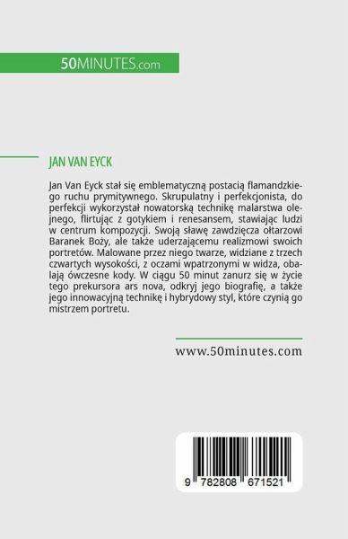Jan Van Eyck stä si¿ emblematyczn¿ postaci¿ flamandzkiego ruchu prymitywnego. Skrupulatny i perfekcjonista, do perfekcji wykorzystä nowatorsk¿ technik¿ malarstwa olejnego, flirtuj¿c z gotykiem i renesansem, stawiaj¿c ludzi w centrum kompozycji. Swoj¿ s¿aw¿ zawdzi¿cza o¿tarzowi Baranek Bo¿y, ale tak¿e uderzaj¿cemu realizmowi swoich portretów. Malowane przez niego twarze, widziane z trzech czwartych wysoko¿ci, z oczami wpatrzonymi w widza, obalaj¿ ówczesne kody. W ci¿gu 50 minut zanurz si¿ w ¿ycie tego prekursora ars nova, odkryj jego biografi¿, a tak¿e jego innowacyjn¿ technik¿ i hybrydowy styl, które czyni¿ go mistrzem portretu.
