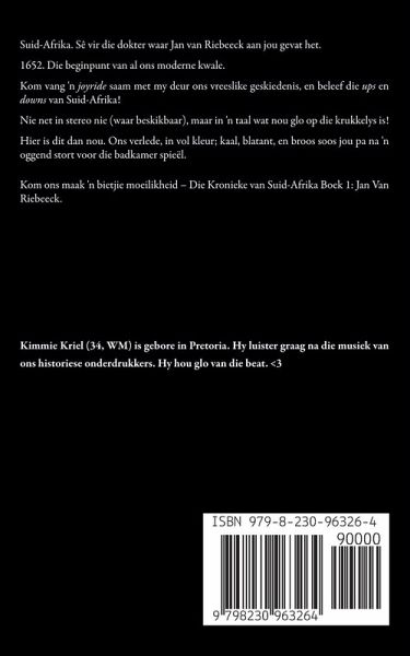 Suid-Afrika. Sê vir die dokter waar Jan van Riebeeck aan jou gevat het. 1652. Die beginpunt van al ons moderne kwale. Kom vang 'n joyride saam met my deur ons vreeslike geskiedenis, en beleef die ups en downs van Suid-Afrika! Nie net in stereo nie (waar beskikbaar), maar in 'n taal wat nou glo op die krukkelys is! Hier is dit dan nou. Ons verlede, in vol kleur; kaal, blatant, en broos soos jou pa na 'n oggend stort voor die badkamer spieël. Kom ons maak 'n bietjie moeilikheid - Die Kronieke van Suid-Afrika Boek 1: Jan Van Riebeeck. Kimmie Kriel (34, WM) is gebore in Pretoria. Hy luister graag na die musiek van ons historiese onderdrukkers. Hy hou glo van die beat.
