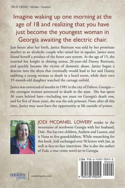 Imagine waking up one morning at the age of 18 and realizing that you have just become the youngest woman in Georgia awaiting the electric chair. Just hours after her birth, Janice Buttrum was sold by her prostitute mother to an alcoholic couple who raised her in squalor. Janice soon found herself a product of the foster care system. At the age of 15, she married her knight in shining armor, 26-year-old Danny Buttrum, and quickly became the victim of domestic abuse. Janice began a descent into the abyss that eventually would lead to her and Danny stabbing a young woman to death in a hotel room, while their own 19-month-old daughter watched the carnage unfold. Janice was convicted of murder in 1981 in the city of Dalton, Georgia-the youngest woman sentenced to death in the state. She has spent 36 years behind bars-including ten years on Georgia's death row, and for five of those years, she was the sole prisoner. Now, after all this time, Janice may soon have the opportunity at life outside of prison.