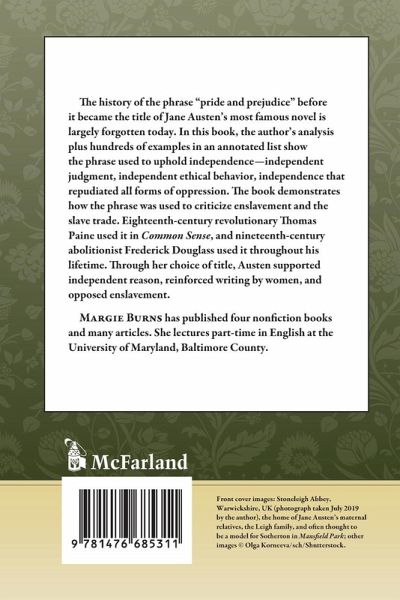 The history of the phrase "pride and prejudice" before it became the title of Jane Austen's most famous novel is largely forgotten today. In particular, most of the reading public is unaware that "pride and prejudice" was a traditional critique adopted by British and American antislavery writers. After Austen's lifetime, the antislavery associations intensified, especially in America. This is the only book about the tradition and the many newly discovered uses of "pride and prejudice" before and after Austen's popular novel. Hundreds of examples in an annotated list show the phrase used to uphold independence--independent judgment, independent ethical behavior, independence that repudiated all forms of oppression. The book demonstrates how, in a natural evolution, the phrase was used to criticize enslavement and the slave trade. Eighteenth-century revolutionary Thomas Paine used it in Common Sense, and nineteenth-century abolitionist Frederick Douglass used it throughout his lifetime. Choosing her title for these resonances, Austen supported independent reason, reinforced writing by women, and opposed enslavement.