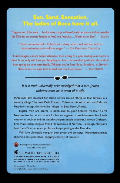 It is a truth universally acknowledged that a nice Jewish widower must be in want of a wife. Jane Austen centered her classic novels around "three or four families in a country village." So does Paula Marantz Cohen in this witty twist on Pride and Prejudice---except this time the "village" is Boca Raton, Florida. Eligible men are scarce in Boca. When good-hearted meddler Carol Newman learns that the wealthy and personable Norman Grafstein has lost his wife, she resolves to marry him off to her lonely mother-in-law, May. Even May's sharp-tongued friend Flo approves of Norman---although Norman's best friend Stan, a cynical professor, keeps getting under Flo's skin. Will May and Norman eventually find happiness? Will Flo succumb to the charms of the suavely cosmopolitan Mel Shirmer? Misunderstandings abound until love conquers both pride and prejudice in this perceptive, engaging comedy of manners. Complications and misunderstandings abound in this romantic and perceptive comedy of manners.