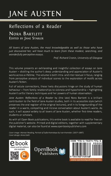 This volume presents an exhilarating and insightful collection of essays on Jane Austen - distilling the author's deep understanding and appreciation of Austen's works across a lifetime. The volume is both intra- and inter-textual in focus, ranging from perceptive analysis of individual scenes to the exploration of motifs across Austen's fiction. Full of astute connections, these lively discussions hinge on the study of human behaviour - from family relationships to sickness and hypochondria - highlighting Austen's artful literary techniques and her powers of human observation. Jane Austen: Reflections of a Reader by (the late) Nora Bartlett is a brilliant contribution to the field of Jane Austen studies, both in its accessible style (which preserves the oral register of the original lectures), and in its foregrounding of the reader in a warm, compelling and incisive conversation about Austen's works. As such, it will appeal widely to all lovers of Jane Austen, whether first-time readers, students or scholars.