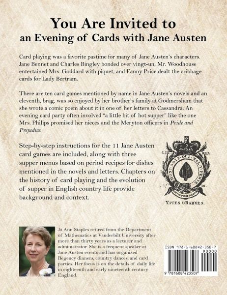 Card playing was a favorite pastime for many of Jane Austen’s characters. Jane Bennet and Charles Bingley bonded over vingt-un, Mr. Woodhouse entertained Mrs. Goddard with piquet, and Fanny Price dealt the cribbage cards for Lady Bertram. There are ten card games mentioned by name in Jane Austen's novels and an eleventh, brag, was so enjoyed by her brother’s family at Godmersham that she wrote a comic poem about it in one of her letters to Cassandra. An evening card party often involved "a little bit of hot supper" like the one Mrs. Philips promised her nieces and the Meryton officers in Pride and Prejudice. Complete instructions for the 11 Jane Austen card games are included in this book, along with three supper menus based on period recipes for dishes mentioned in the novels and letters. Chapters on the history of card playing and the evolution of supper in English country life provide background and context.