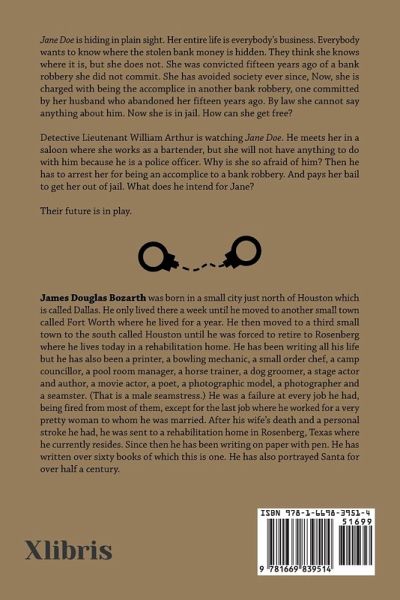 Jane Doe is hiding in plain sight. Her entire life is everybody's business. Everybody wants to know where the stolen bank money is hidden. They think she knows where it is, but she does not. She was convicted fifteen years ago of a bank robbery she did not commit. She has avoided society ever since, Now, she is charged with being the accomplice in another bank robbery, one committed by her husband who abandoned her fifteen years ago. By law she cannot say anything about him. Now she is in jail. How can she get free? Detective Lieutenant William Arthur is watching Jane Doe. He meets her in a saloon where she works as a bartender, but she will not have anything to do with him because he is a police officer. Why is she so afraid of him? Then he has to arrest her for being an accomplice to a bank robbery. And pays her bail to get her out of jail. What does he intend for Jane? Their future is in play.