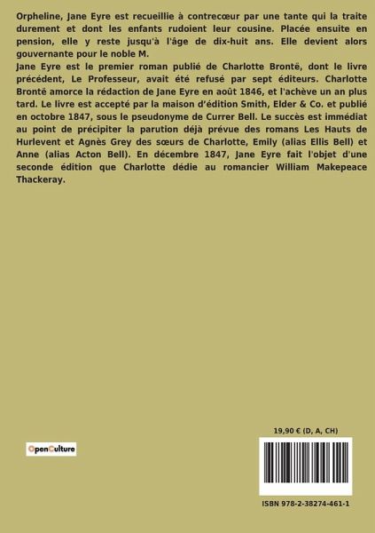 "Jane Eyre" est un roman de Charlotte Brontë qui suit la vie tumultueuse de son héroïne éponyme, une orpheline confrontée à de nombreuses épreuves dès son plus jeune âge. Le récit commence avec Jane vivant chez sa tante, Mme Reed, où elle est maltraitée et méprisée par sa famille adoptive. Isolée et souvent punie, Jane développe un changement profond et un esprit indépendant. Après un incident particulièrement traumatisant dans la chambre rouge, où elle est enfermée en guise de punition, Jane tombe malade. Sa santé fragile attire l'attention de M. Loyd, un pharmacien bienveillant, qui suggère qu'elle soit envoyée en pension. Cette suggestion marque le début d'un tournant dans la vie de Jane, lui offrant une échappatoire à l'oppression qu'elle subit chez les Reed. Le roman explore des thèmes tels que l'injustice sociale, la quête d'identité et l'émancipation personnelle. À travers les yeux de Jane, le lecteur est invité à réfléchir sur les normes sociales de l'époque victorienne et sur la lutte pour l'égalité et la dignité humaine. Le style narratif de Brontë, mêlant réalisme et introspection, permet de plonger au cur des émotions et des pensées de Jane, rendant son parcours d'autant plus poignant et universel.
