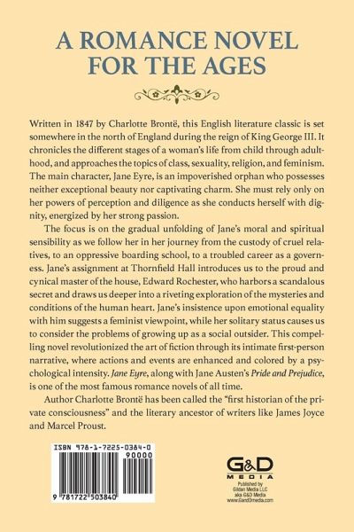 >/b> Written in 1847 this English literature classic is set somewhere in the north of England during the reign of King George III. It chronicles the different stages of a woman's life from child through adulthood, and approaches the topics of class, sexuality, religion and feminism. The main character, Jane Eyre, is an impoverished orphan who possesses neither exceptional beauty nor captivating charm. She must rely only on her powers of perception and diligence as she conducts herself with dignity, energized by her strong passion. The focus is on the gradual unfolding of Jane's moral and spiritual sensibility as we follow her in her journey from the custody of cruel relatives, to an oppressive boarding school, to a troubled career as a governess. Jane's assignment at Thornfield Hall introduces us to the proud and cynical master of the house, Edward Rochester, who harbors a scandalous secret and draws us deeper into a riveting exploration of the mysteries and conditions of the human heart. Jane’s insistence upon emotional equality with him suggests a feminist viewpoint, while her solitary status causes us to consider the problems of growing up as a social outsider. This compelling novel revolutionized the art of fiction through its intimate first-person narrative, where actions and events are enhanced and colored by a psychological intensity. Jane Eyre, along with Jane Austen’s Pride and Prejudice, is one of the most famous romance novels of all time. Author Charlotte Brontë has been called the 'first historian of the private consciousness' and the literary ancestor of writers like James Joyce and Marcel Proust.