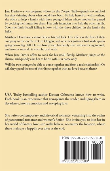 Jane Davies-a new pregnant widow on the Oregon Trail-spends too much of her time thinking about what could have been. To help herself as well as others, she offers to help a family with three young children whose mother has passed by cooking their meals for them. Her only intention is to help the other family. Soon she finds herself falling in love with the three children in the family she helps. Matthew Henderson cannot believe his bad luck. His wife was the first of their company to die on the trek to Oregon, and now he's gotten a bad ankle sprain going down Big Hill. He can barely keep his family alive without being injured, and now he must do it when he can't walk. When Jane Davies offers to cook for his small family, Matthew jumps at the chance, and quickly asks her to be his wife-in name only. Will the two strangers be able to come together and form a real relationship? Or will they spend the rest of their lives together with no love between them?