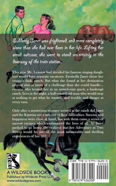 Suddenly Janet was frightened, and more completely alone than she had ever been in her life. Lifting her small suitcase, she went to stand uncertainly in the doorway of the train station... This year Mr. Lennon had decided his famous singing daughters would have separate vacations. Excitedly Janet chose her cousin's dude ranch. But what she found at her destination proved almost more of a challenge than she could handle... cousins who treated her as an unwelcome guest, a bankrupt ranch, fires in the night, a half-crazed old man who would stop at nothing to get what he wanted, and trouble and danger at every turn. Only after a mysterious stranger arrived at the ranch did Janet and the Kaywins see a way out of their difficulties. Success and happiness were close at hand, but with them came a series of narrow escapes which endangered the lives of all. As Janet packed to go home she realized that her Adventure at Two Rivers would be one of the most memorable and thrilling experiences of her life!
