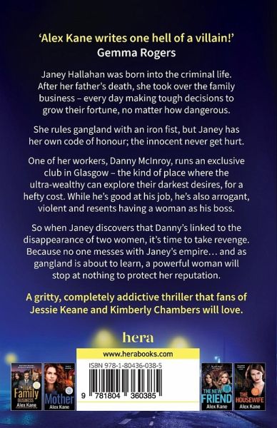 'Alex Kane is back and reminding us all why she is just brilliant. I have devoured this book in just one sitting and have no regrets.' ¿¿¿¿¿ Reader Review It takes a strong woman to run a family - and an empire Janey Hallahan was born into the criminal life. After the death of her father, she became head of the family business - every day making dark decisions that make her family firm richer, no matter how dangerous. While Janey rules gangland with an iron fist, she always sticks to her own code of honour, and the innocent never get hurt. One of her workers, Danny McInroy runs an exclusive club in Glasgow - the kind of place where the ultra-wealthy can fulfil their darkest desires, for a hefty cost. He's good at his job, but his arrogance and propensity to violence makes him a liability. But when Janey discovers that he's linked to the disappearance of two women, it's time to take revenge. Because no one messes with Janey, or her empire... and as gangland is about to learn, a powerful woman will stop at nothing to protect her reputation. A pulse-racing, totally gripping thriller that fans of Jessie Keane, Kimberly Chambers and Heather Burnside won't be able to put down. Readers are loving Janey: 'A must read book...gripping and twisted.'¿¿¿¿¿ Reader Review 'Absolutely loved this book I didn't want it to end. I was gripped from start to finish.'¿¿¿¿¿ Reader Review 'Seriously fast paced and gritty from the very start.'¿¿¿¿¿ Reader Review 'I have read all of Alex Kanes books and can honestly say once you pick one up it's really hard to put down.'¿¿¿¿¿ Reader Review 'I waited in anticipation for this book to come out...Alex kane should be up there with the top authors as her books are phenomenal.' ¿¿¿¿¿ Reader Review 'Superb strong Characters with a gripping story line, this book will have you hooked from the start.'¿¿¿¿¿ Reader Review 'This book is already an absolute belter. I couldn't put it down. So many twists and turns. The writing was amazing.'¿¿¿¿¿ Reader Review Praise for Alex Kane: 'Grit, twists and great characters. Alex Kane at her finest!' Emma Tallon, author of Her Payback 'Another fantastic gritty Gangland thriller from Alex Kane. Five stars from me!' Gemma Rogers, author of The Feud