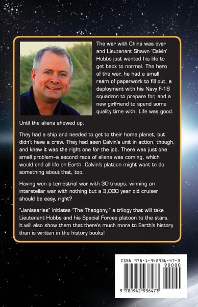 The war with China was over and Lieutenant Shawn 'Calvin' Hobbs just wanted his life to get back to normal. The hero of the war, he had a small ream of paperwork to fill out, a deployment with his Navy F-18 squadron to prepare for, and a new girlfriend to spend some quality time with. Life was good. Until the aliens showed up. They had a ship and needed to get to their home planet, but didn't have a crew. They had seen Calvin's unit in action, though, and knew it was the right one for the job. There was just one small problem--a second race of aliens was coming, which would end all life on Earth. Calvin's platoon might want to do something about that, too. Having won a terrestrial war with 30 troops, winning an interstellar war with nothing but a 3,000 year old cruiser should be easy, right? "Janissaries" initiates "The Theogony," a trilogy that will take Lieutenant Hobbs and his Special Forces platoon to the stars. It will also show them that there's much more to Earth's history than is written in the history books!