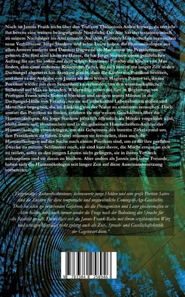 Noch ist Jannis Frank nicht über den Tod von Thelonious Arden hinweg, da erreicht ihn eine weitere beängstigende Nachricht: Der Alte hat ihn testamentarisch zu seinem Nachfolger im Amt ernannt. Auf dem Planeten Maa herrschen inzwischen neue Verhältnisse. Jorge Stankow und seine Leute haben die Humanökologen aus allen Ämtern entfernt und Damion Dagwood als Marionette ins Präsidentenamt gehievt. Jannis und seine Freunde sind kaum zu Hause, da hat Jorge Stankow einen gefährlichen Auftrag für sie: Sie sollen auf dem wilden Kontinent Faraday die Kinder von Maa finden, eine einst verbotene Kolonisten-Partei, die sich vor langer Zeit in den Dschungel abgesetzt hat. Stankow glaubt, dass die Kinder ein Poetikon besitzen, und dass es die Aufgabe von Jannis als dem letzten Magister Primus sei, dieses Poetikon wieder mit dem Szientikon zu verbinden, um den wissenschaftlichen Stillstand auf Maa zu beenden. Widerwillig reisen die fünf in Begleitung von Professor Frank sowie General Sheridan und einigen seiner Männer in die Dschungel-Hölle von Faraday, wo sie auf unbekannte Lebensformen stoßen und Menschen begegnen, die im Einklang mit der Natur zu existieren versuchen. Doch anstatt das Poetikon zu finden, erfahren sie nur weitere Geschichten über die Humanökologen. Als Jorge Stankow plötzlich öffentlich als Mörder vorgeführt wird, bleibt ihnen nur, abzutauchen und in die geheimen Handschriften-Archive der Humanökologen einzudringen, um das Geheimnis des inneren Zirkels rund um den Präsidenten zu lüften. Dabei müssen sie feststellen, dass auch die Humanökologen auf der Suche nach einem Poetikon sind, um es für ihre perfiden Zwecke zu nutzen. Schlimmer noch, sie sind kurz davor, die Macht erneut an sich zu reißen, sollte es den jungen Leuten nicht gelingen, sie in ihrem Versteck aufzuspüren und sie daran zu hindern. Aber anders als Jannis und seine Freunde, haben sich die Humanökologen seit langer Zeit auf diese Auseinandersetzung vorbereitet."Tiefgründiges Zukunftsabenteuer, liebenswerte junge Helden und eine große Portion Satire sind die Zutaten für diese temporeiche und ungewöhnliche Coming-of-Age-Geschichte. Doch bei allen zu bestehenden Gefahren, die die Protagonisten und Leser gleichermaßen in Atem halten, wird auch immer wieder die Frage nach der Bedeutung der Sprache für die Realität gestellt. Dabei lässt sich die Jannis-Frank-Reihe mit ihrem erzählerischen Witz und schrägen Einfällen nicht zuletzt als Zeit-, Sprach- und Gesellschaftskritik der Gegenwart lesen."