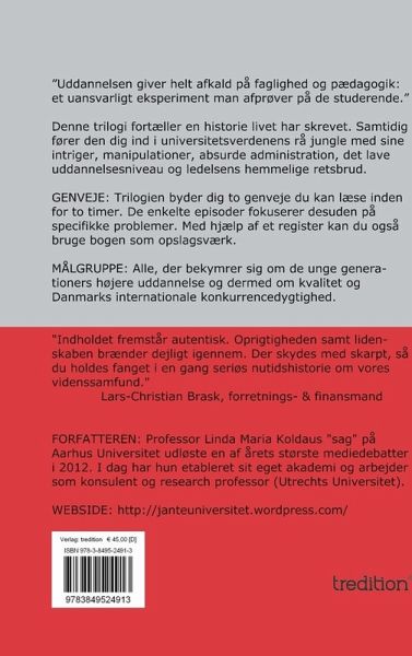THE WRITING ON THE WALLThe trilogy Jante Universitet offers a comprehensive critique of the Danish university system, showing the general consequences of the New Public Management system for a country s education and its economy.HANDBOOK AND NOVEL-LIKE STORYThe trilogy offers the unique combination of a handbook and an authentic story. The novel-like story line is based on the experiences of a German professor, documented over three years at a Danish university. As a systematic handbook, Jante Universitet offers two short cuts that can be read within two hours. The individual episodes depict the absurdities of everyday life at a university, from department structures and petty intrigues through a scandalous teaching strategy to the questionable management methods of administrators that have total power over the academic staff. The handbook is a tool for those who are interested in and have responsibility for university education not only in Denmark, but in all countries where NewPublic Management has begun to corrode higher education. VOLUME 1: DEN SKØNNE FACADE (The Beautiful Façade)The German professor Liane is being headhunted by Jante Universitet to fill the renowned chair of musicology. Liane, whose work meets the highest standards of international competetiveness and academic etiquette, trusts in the beautiful façade that is being presented to her by the dean and the department director. Yet within a year she discovers an appalling system behind this façade: a system that has been estranged entirely from academic standards and critical thought. DEN SKØNNE FACADE tells of power games, intrigues, and absurd curricula that masquerade as world class .BACKGROUNDThe trilogy is based on the so-called Koldau Case (Koldau-sagen) that caused a major scandal in Denmark in 2012, concerning the right of university staff to freedom of speech, the mismanagement of and totalitarian structures within Danish universities, the low standards of university education inthe humanities, the disastrous consequences of the Danish University Law of 2003.Having been headhunted by her university in 2009, Prof. Dr. Linda Maria Koldau voiced her criticism of the scandalous university standards publicly in 2011. In consequence the university management forced her to resign from her position as Chair of Musicology, both breaking the law and using unprincipled methods known from totalitarian systems.