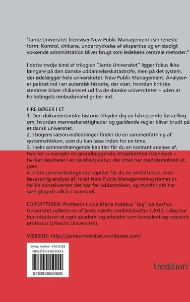 THE WRITING ON THE WALL The trilogy Jante Universitet offers a comprehensive critique of the Danish university system, showing the wide-ranging consequences of New Public Management to a country s educational standards and its economy. HANDBOOK AND NOVEL-LIKE STORY The trilogy offers the unique combination of a handbook and an authentic story. The novel-like story line is based on the experiences of a German professor, documented over a 3-year period at a Danish university.As a systematic handbook, Jante Universitet can be read within two hours using the clearly marked short cuts . The individual episodes depict the absurdities of everyday life at a university, from departmental structures and petty intrigues through a scandalous teaching strategy to the questionable management methods of administrators who have total power over the academic staff.The handbook is a tool for those who are interested in and have responsibility for university education not only in Denmark, but in all countries where New Public Management has begun to negatively impact higher education. VOLUME 3: TOTALITARIAN STRUCTURESA totalitarian regime does not tolerate criticism. Office arrest is one of the sanctions such a regime will use as punishment for a critical professor for example in Denmark.This is what Professor Liane realizes after having rightfully criticized the scandalous standards at Jante University. The tricks used by the management to bully the critical professor and drive her out of her position would be fitting for a crime novel or a Kafkaesk story, in which human rights and a democratic legal system disappear into thin air.TOTALITARIAN STRUCTURES comprises several little books in one volume. Six chapters present a concise analysis of the New Public Management system and its fatal consequences for education and society. A unit of five chapters illustrates why legal security stands on shaky ground in Denmark. The systematic introductions to the six seasons in the book offer you a short cut to the basic criticism. BACKGROUND The trilogy is based on the so-called Koldau Case that caused a major scandal in Denmark in 2012, concerning the right of university staff to freedom of speech, the mismanagement of and totalitarian structures within Danish universities, the low standards of university education in the humanities the disastrous consequences of the Danish University Law of 2003.