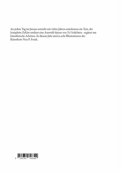 An jedem Tag im Januar entsteht seit vielen Jahren mindestens ein Text, der komplette Zyklus umfasst eine Auswahl daraus von 31 Gedichten - ergänzt um künstlerische Arbeiten. In diesem Jahr sind es acht Illustrationen der Künstlerin Vera P. Frank.