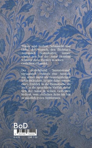 Trauer und Verlust, Sehnsucht und Liebe, der Wunsch, den flüchtigen Augenblick festzuhalten: immer wieder neu hat der Autor Henning Schweer diese Themen in seinen Gedichten erkundet. Der vorliegende Gedichtband "Januarstrand" versammelt erstmals eine Auswahl aus seiner mehr als zwanzigjährigen Schreibtätigkeit. Er gibt dabei sowohl einen Einblick in die thematische als auch in die sprachliche Vielfalt, derer sich der Autor in seinen Gedichten bedient, vom einfachen Reim bis hin zu gänzlich freien Textformen.