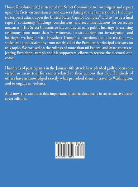 House Resolution 503 instructed the Select Committee to "investigate and report upon the facts, circumstances, and causes relating to the January 6, 2021, domestic terrorist attack upon the United States Capitol Complex" and to "issue a final report" containing "findings, conclusions, and recommendations for corrective measures." The Select Committee has conducted nine public hearings, presenting testimony from more than 70 witnesses. In structuring our investigation and hearings, we began with President Trump's contentions that the election was stolen and took testimony from nearly all of the President's principal advisors on this topic. We focused on the rulings of more than 60 Federal and State courts rejecting President Trump's and his supporters' efforts to reverse the electoral outcome. Hundreds of participants in the January 6th attack have pleaded guilty, been convicted, or await trial for crimes related to their actions that day. Hundreds of others have acknowledged exactly what provoked them to travel to Washington, and to engage in violence. And now you can have this important, historic document in an attractive hardcover edition.