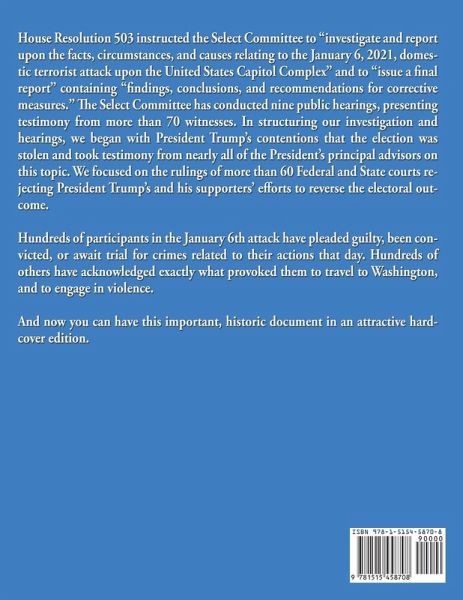 House Resolution 503 instructed the Select Committee to "investigate and report upon the facts, circumstances, and causes relating to the January 6, 2021, domestic terrorist attack upon the United States Capitol Complex" and to "issue a final report" containing "findings, conclusions, and recommendations for corrective measures." The Select Committee has conducted nine public hearings, presenting testimony from more than 70 witnesses. In structuring our investigation and hearings, we began with President Trump's contentions that the election was stolen and took testimony from nearly all of the President's principal advisors on this topic. We focused on the rulings of more than 60 Federal and State courts rejecting President Trump's and his supporters' efforts to reverse the electoral outcome. Hundreds of participants in the January 6th attack have pleaded guilty, been convicted, or await trial for crimes related to their actions that day. Hundreds of others have acknowledged exactly what provoked them to travel to Washington, and to engage in violence. And now you can have this important, historic document in an attractive hardcover edition.