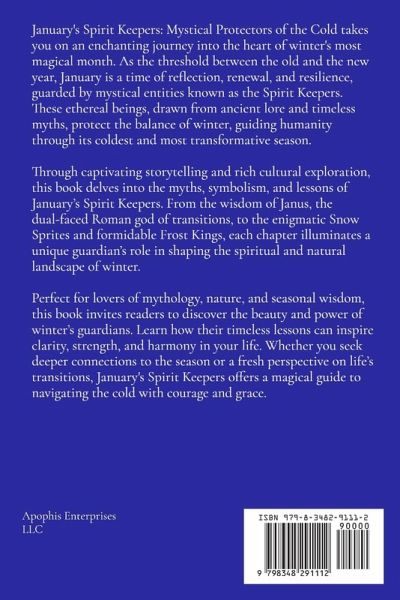 January's Spirit Keepers: Mystical Protectors of the Cold takes you on an enchanting journey into the heart of winter's most magical month. As the threshold between the old and the new year, January is a time of reflection, renewal, and resilience, guarded by mystical entities known as the Spirit Keepers. These ethereal beings, drawn from ancient lore and timeless myths, protect the balance of winter, guiding humanity through its coldest and most transformative season. Through captivating storytelling and rich cultural exploration, this book delves into the myths, symbolism, and lessons of January's Spirit Keepers. From the wisdom of Janus, the dual-faced Roman god of transitions, to the enigmatic Snow Sprites and formidable Frost Kings, each chapter illuminates a unique guardian's role in shaping the spiritual and natural landscape of winter. Perfect for lovers of mythology, nature, and seasonal wisdom, this book invites readers to discover the beauty and power of winter's guardians. Learn how their timeless lessons can inspire clarity, strength, and harmony in your life. Whether you seek deeper connections to the season or a fresh perspective on life's transitions, January's Spirit Keepers offers a magical guide to navigating the cold with courage and grace.