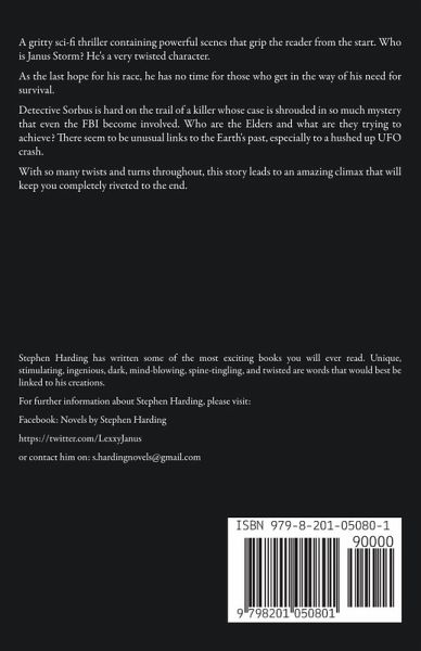 A gritty sci-fi thriller containing powerful scenes that grip the reader from the start. Who is Janus Storm? He's a very twisted character. As the last hope for his race, he has no time for those who get in the way of his need for survival. Detective Sorbus is hard on the trail of a killer whose case is shrouded in so much mystery that even the FBI become involved. Who are the Elders and what are they trying to achieve? There seem to be unusual links to the Earth's past, especially to a hushed up UFO crash. With so many twists and turns throughout, this story leads to an amazing climax that will keep you completely riveted to the end.