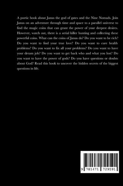 A unique and rare gothic poetry book full of sex, serial murder, witchcraft, and other forbidden taboo topics. Discover the meaning and purpose of your life hidden in this book's steganography cipher and riddles. Join Janus the god of gates to travel through time and other parallel realms to find enchanted coins that can grant your deepest desires to come true! Have hope and believe, and your dreams will manifest in reality! However, be warned, that a masked serial killer is hunting and collecting these enchanted coins too! This document contains adult themes of graphic violence, sex scenes and nudity, demonic possession, alien abduction, suicide, drugs, and coarse language. Children or anyone with a faint heart or easily offended should NOT read this book. REPEAT! Reading this book is FORBIDDEN to children under 21 years old and anyone easily offended. Do not read the spells in this book out loud verbally. Do not attempt to summon or contact any of the people, demons, or entities discussed in this book. Nothing in this book should be acted on and if you choose to continue to read this book then that will be regarded as you consenting to take full liability to all undesirable outcomes. Are you brave enough to go on a gothic adventure of horror with Janus and the Nine Nomads?